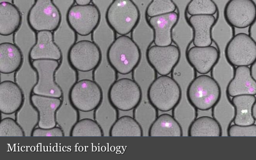 The third major theme is microfluidics, where our focus is on the use of multiphase fluid flow to create, control and use emulsions with microfluidic devices. We engineer novel structures made from colloids, polymers or lipids that can be used to encapsulate materials. These structures are formed from multiple emulsions which are controllably produced with microfluidic devices. In addition, we are developing microfluidic devices that use individual droplets as microreactors, with volumes as small as femtoliters. The precise control over these droplets afforded by the microfluidic devices enables us to use them as reaction vessels for very high throughput studies of biological reactions. We are developing methods to improve the functionality of enzymes through directed evolution of their function, and to study the properties of large populations of individual cells encapsulated within the droplets.